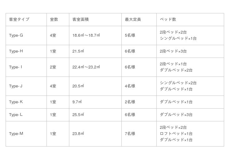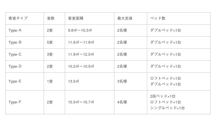 部屋タイプは全部で13つ。内装は高架下という限られた空間の中を有効活用したデザインが特徴で、2名定員のダブルタイプの他、都内で数の少ない4名以上が同じお部屋で宿泊できる、家族やグループ旅行向きの大人数部屋タイプ(最大7名まで)まで多数用意。国内外の観光客、および近隣ワーカー等をターゲットに価格帯を抑えつつも居心地の良い宿泊施設をご提供いたします。