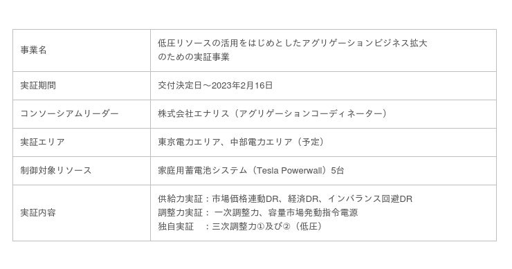 本実証事業では、株式会社エナリス(本社:東京都千代田区、代表取締役社長:都築実宏、以下、エナリス)をコンソーシアムリーダーとするコンソーシアムに参画し、シェアリングエネルギーはリソースアグリゲーター(RA)として複数のTesla Powerwall(家庭用蓄電池システム)のエネルギーリソースを活用して、供給力実証、調整力実証(一次調整力実証、発動指令電源応動)、三次調整力実証に取り組みます。
