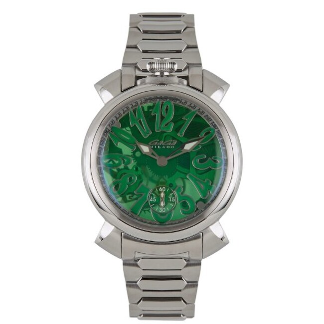 GaGa MILANOの代表コレクション「マヌアーレ48mm」から、ブランドを象徴する大きなリューズとユニークなインデックスデザインは引き継がれ、かつ近代的なスマートさを加えステンレススチールの輝きがエレガンスな佇まいを印象づけます。