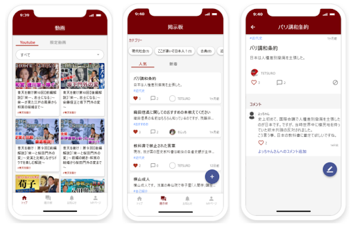 YouTubeチャンネル「人生を変える歴史と古典の教室「新倉塾」」で教えるTETSURO氏のコミュニティアプリを開発運営しています。機能は、限定動画(youtubeの規約でリリースできないものを表示)、掲示板機能、お知らせ機能等があります。