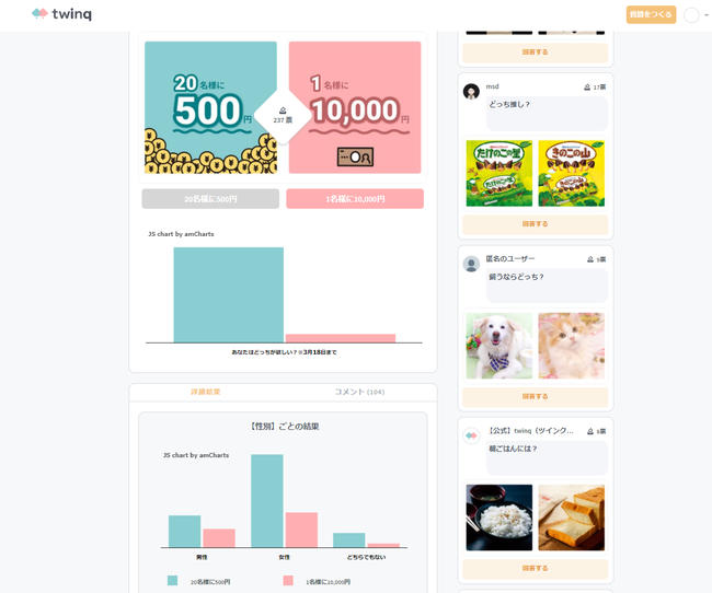 写真を使って二択の質問を投稿、ワンタップで回答ができる投票サービスです。