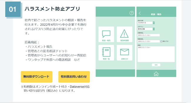 Microsoft Power Appsを用いてDX化されたい企業様向けにアドバイスサービスを行っております。下記ページで3つのサービス(ハラスメント防止アプリ、日報管理アプリ、クレーム管理アプリ)を無料で配布しています。無料と有料があり、無料に関してはO365の利用が必須となります。