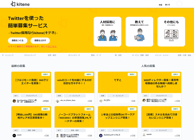 Twitter採用が気軽に出来る「募集・応募・採用」サービスです。以前Twitter採用で話題になっていた「Bosyu」というサービスに似たサービスになります。
