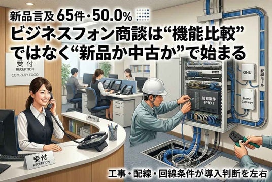 調査では、ビジネスフォン関連相談のうち、「新品」に関する言及が65件確認され、関連相談の50.0%を占めました。同時に、中古比較、工事・設置条件、主装置、回線・光電話条件、番号維持といった周辺論点も高頻度で確認されました。