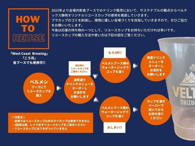 その新たな取り組みとしまして、2023年1月21日(土)22日(日)の鹿児島レブナイズ戦のホーム戦より、ベルメシおよびWCB、こう月の飲食ブースで販売される各種ドリンク類を提供する際に、ベルテックスオリジナルリユースカップ(購入型)の使用を推奨します。