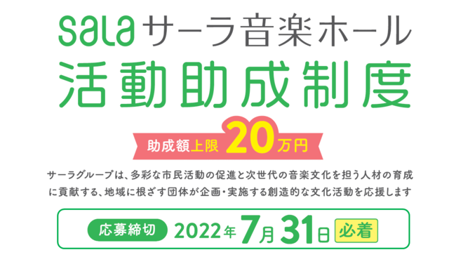 株式会社サーラコーポレーション(本社:愛知県豊橋市、代表取締役社長兼グループ代表・CEO:神野吾郎)を持株会社とし生活関連企業46社で構成するサーラグループは、サーラ音楽ホール(浜松市市民音楽ホール)における文化芸術活動を支援する「サーラ音楽ホール活動助成制度」(以下「本助成」)を新設し、2022年6月15日(水)より希望者の募集を開始いたします。