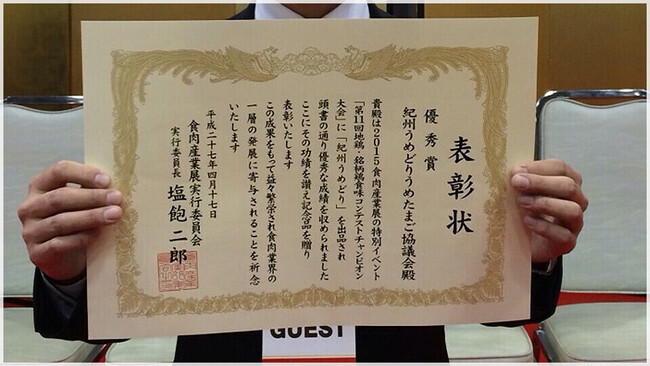 その肉質とおいしさが評価され、『紀州うめどり』はさまざまな賞を受賞。商品化されてまだ間もない2008年の食肉産業展で行われた鶏肉のコンテストでは優勝を果たしました。2006年以降、過去10年間で優勝した鶏だけを集めて行われたグランドチャンピオン大会でも、全国の有名なブランド地鶏を押しのけて準優勝に輝きました。全国的に知られている有名レストランでも数多く採用されており、和歌山の地域ブランドとして、安全・安心を基本に幅広い分野で優れた県産品に与えられる「プレミア和歌山」にも認定されています。