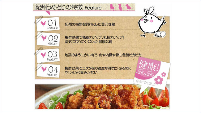 『紀州うめどり』は、和歌山の特産品である梅干し「紀州南高梅」を作る過程でできる梅酢から塩分を抜いた飼料を与えることで生まれた、安心・安全で栄養価の高いブランド鶏。