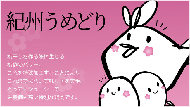 和歌山の特産品である梅干を作る過程でできる梅酢を有効活用して生まれた、安心・安全で栄養価の高いブランド鶏。委託先の養鶏組合の経営問題のために生産停止に追い込まれた銘柄鶏の復活をめざすプロジェクト。