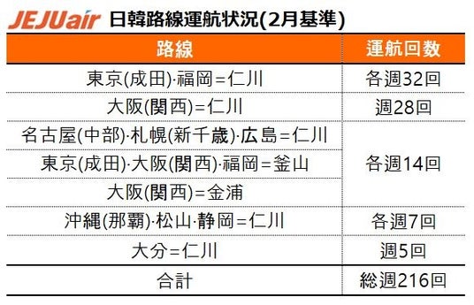 チェジュ航空は東京(成田)・大阪(関西)・福岡・名古屋(中部)など主要幹線都市の他にも、松山・大分・静岡・広島などの地方都市と韓国をつなぐ直航路線を拡大しつつ、韓国旅行に行く日本人旅行客の利便性を高めている。 特に1月12日からは大分=仁川路線を週3回から週5回(月・火・木・金・土)に増やし、広島=仁川路線も週7回から週14回に増便した。