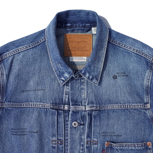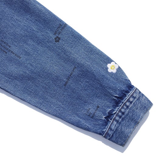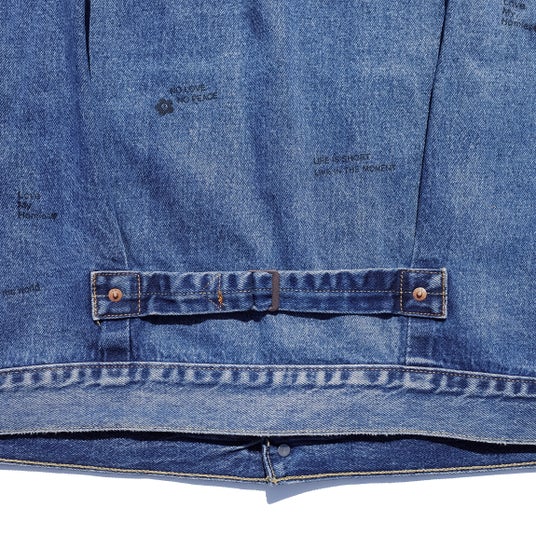 裾部分にはネームタグ、袖部分にはピースフラワーワッペンを配置。背面にはウエスト調節が可能なバックシンチ付き。