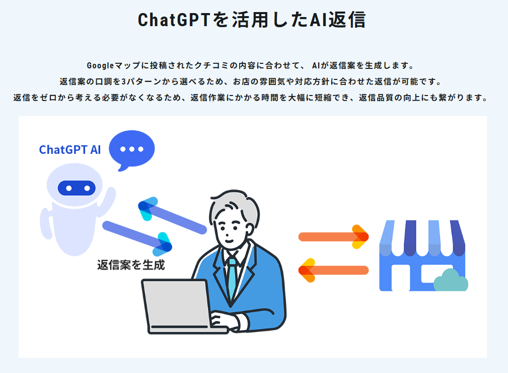 『マップ職人』のAI返信機能は、店舗の従業員様から頂いた上記の具体的な悩みを解決するために、