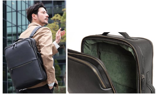 落ち着きのある上質な革の光沢と高級感のあるスエード調の内装で、シーンを選ばないクールなデザインに仕上げました。「欲しかった機能性」「ビジネスでもプライベートでもマッチするデザイン性」を融合し、”こんなレザーリュックが欲しかった”をお届けします。