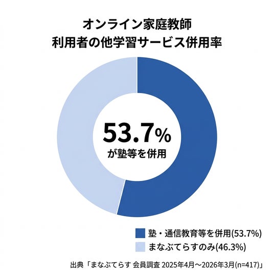 調査は2025年4月から2026年3月までの12ヶ月間にわたり実施されたもので、オンライン家庭教師を利用する家庭の 53.7% が学習塾や通信教育、授業動画サービスなど、ほかの学習サービスを併せて利用している ことが分かった。