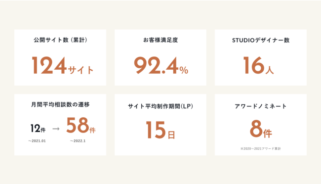 2022年1月時点で制作数は日本一の124サイト超え、お客様満足度は92.4%(2022年1月時点)と高い評価を頂いております。gaz Inc.にはSTUDIO公式アンバサダーを含むSTUDIOデザイナーが16名在籍しており、クオリティ維持とサイト制作時間短縮が可能です。gaz Inc.ではデザインの無料相談を承っていますので、デザイン面の強化やサービスの改善をしたいという企業様は是非ご相談ください。