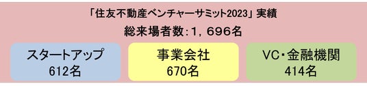 当社が主催する本イベントの最大の特長は、事業会社からの参加者数が多いことにあります。通常のスタートアップイベントでは、スタートアップとベンチャーキャピタルのみが集まるケースが少なくない中で、昨年の「住友不動産ベンチャーサミット」では、事業会社からスタートアップ企業を上回る670名の皆様にご参加いただきました。参加者からは「ここまで多くの事業会社が参加しているイベントは見たことがない」などとご好評いただきました。スタートアップ企業の成長には、資金面をサポートする金融機関だけでも販路や協業先としての事業会社だけでも不十分です。スタートアップ企業を含めた3者が互いに交わることで加速度的な成長を成し遂げることが可能になります。
