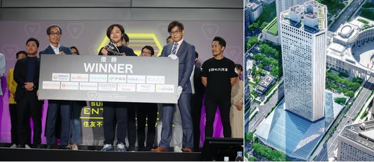 左:「住友不動産ベンチャーサミット2023」の様子、右:新宿住友ビル 外観