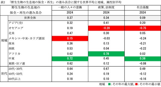 ・20代、30代の人々は、他の世代よりも野生生物の生息地の保全・再生が進んでいると考えている人が多い。(表2:報告書 表9から作成)