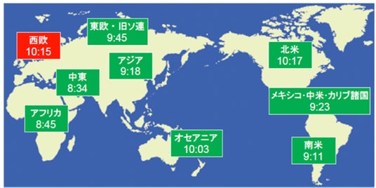・世界で針が戻った地域が多い中、日本は昨年から針が6分進んで9時37分となった。(図3)