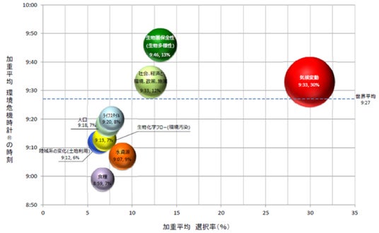 ・世界全体の「地球環境の変化を示す項目」を環境危機時計(R) の時刻順に並べると、「生物圏保全性(生物多様性)」(9時46分)、「気候変動」(9時33分)、「社会、経済と環境、制作、施策」(9時33分)が世界平均(9時27分)よりも進んでいる。(図6)