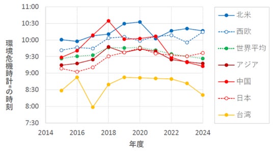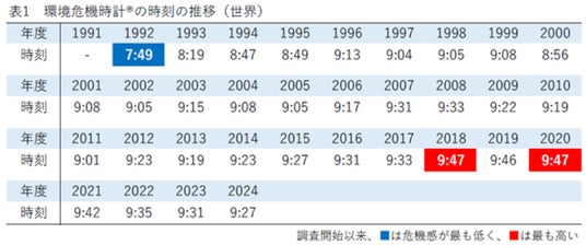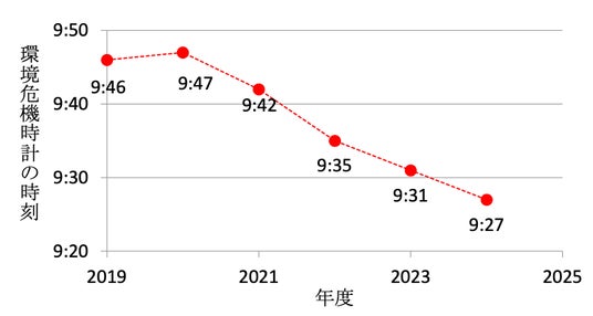 ● 今年の環境危機時計(R)の時刻は9時27分で、昨年より4分針が戻った。2021年から4年連続で時計の針が戻った。