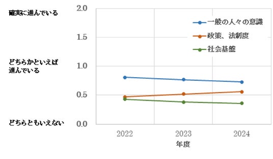 (「全く進んでいない」を「-2」、「どちらかといえば進んでいない」を「-1」、「どちらかといえば進んでいる」を「+1」、「確実に進んでいる」を「+2」として数値化し平均値を出した)。