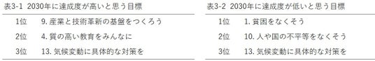 17ある持続可能な開発目標 (SDGs)の中で、2030年に達成度が高い・低いと思う目標をそれぞれ3 つ選んでもらった。上位の回答の3つの目標を表3-1, 3-2に示した。それぞれの地域、国ごとのデータは、「2024年調査報告書」に記載。