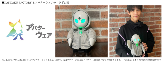 アバターロボットの衣装製作を手掛けるコミュニティ『アバターウェア』とKANKAKU FACTORYがコラボ。 KANKAKU FACTORYのパーカーのアバターウェアバージョンを作成し展示いたします。