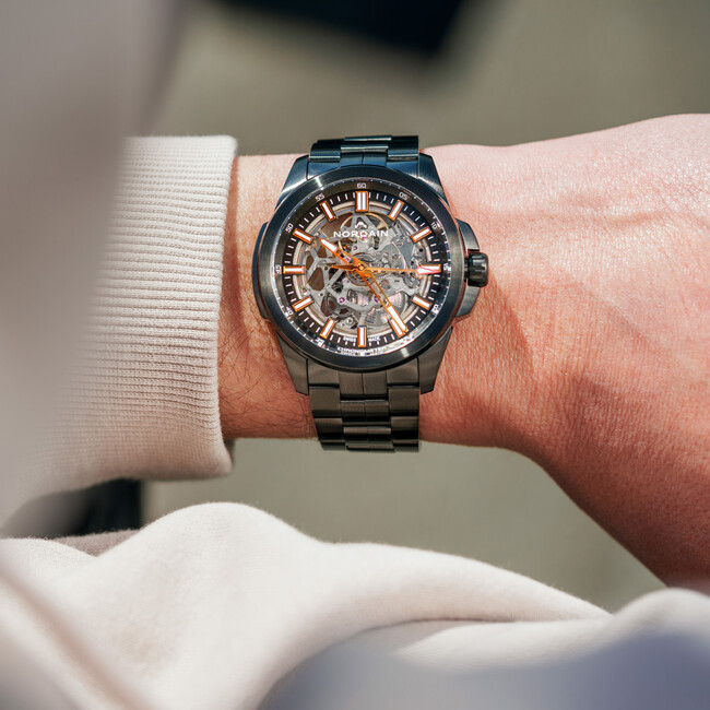 2021年、2022年、連続して成功を収めたインディペンデンス・スケルトンモデル。その系譜を受け継ぐモデルとして、2023年、ノルケインは、DLCコーティングを施したケースとレッドゴールドカラーの針を備えたバージョンを発表。ムーブメントのスケルトン構造は、梁構造の建築原理に基づいており、各支持点は少なくとも2本以上のアームによって保持されています。インデックスとスケルトン構造の時針、分針、秒針には、通常のスーパールミノバよりも60%強いX1スーパールミノバを塗布。42mmのケースはポリッシュ、サテン、サンドブラスト仕上げで、ノルケインプレート(DLCコーティング)も装備。この印象的なタイムピースには、その場でマイクロアジャストできるDLCコーティングのステンレスステチール製ブレスレット(726,000円)、またはミラネーゼデザインのブラックラバーストラップ(651,200円)があります。このラバーストラップは、パートナーであるBIWI SAが開発したものです。フェイス上とケースバックのサファイアガラスを通して見えるのは、クロノメーター認定のキャリバーNN08Sを鑑賞できます。