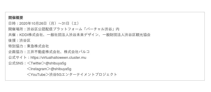 いよいよ10月26日より開催する「バーチャル渋谷 au 5G ハロウィーンフェス」の全コンテンツの詳細情報が解禁されます。( バーチャル渋谷 au 5G ハロウィーンフェス 公式サイト:https://virtualhalloween.cluster.mu )