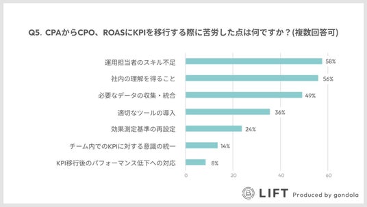 ・KPI移行における最大の課題は「運用担当者のスキル不足」(58%)と「社内の理解獲得」(56%)。
