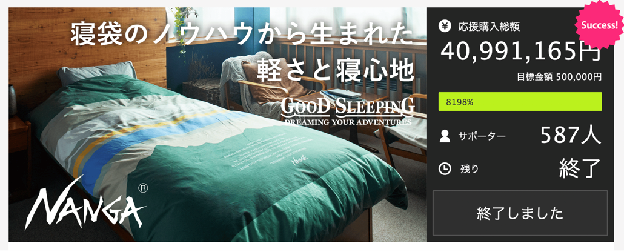 アトツギである横田智之氏は、寝袋などのアウトドアアイテムの製造で培った技術やノウハウを用いて、異分野である家庭用の布団レーベル「GOOD SLEEPING」を立ち上げる際にも「Makuake」でプロジェクトを実施しました。実は同社の前身は1941年創業の布団メーカーであることや、もともと自社の従業員向けに限定生産していた布団が好評で、一般の方にも届けようという声が上がり商品化に向けて動いたという開発の裏話をプロジェクトページ上で伝え、4,000万円を超える応援購入総額を記録しました。