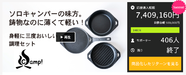 鋳物フライパンなどの「UNILLOY」や「SSC」ブランドを展開する同社では、コンパクトで軽量な鋳物調理器具シリーズ「SSCamp!」を「Makuake」で発表し、サポーターからの応援購入を募りました。先にプロジェクトを実施した「UNILLOY」の愛用者から、ソロキャンプでも使えるような手頃なサイズのフライパンが欲しい、というリクエストを受け、「SSCamp!」の商品開発を決めたといいます。使い込むことで良さが増していく鋳物の性質から、プロジェクトではキャンプだけでなく日常使いも提案し、400人以上のサポーターが応援購入しました。
