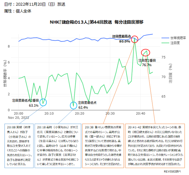 ご家庭に人体認識技術を搭載した機器を設置し、テレビスクリーンの「視られている量」を測るREVISIO株式会社(2022/10/1にTVISION INSIGHTSから社名を変更、所在地 :東京都千代田区、代表取締役社長 郡谷 康士、以下REVISIO)は、2022年1月にスタートした、三谷幸喜さん脚本・小栗旬さん主演の『鎌倉殿の13人』を、毎放送回、視聴者がどのシーンに注目したのかを分析しています。