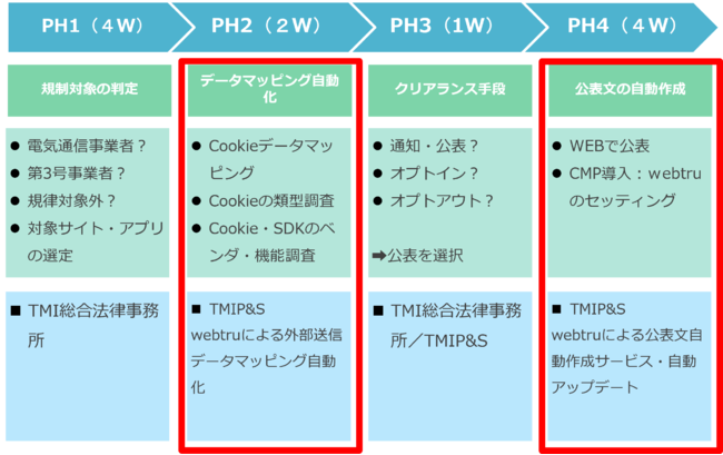 企業が改正電気通信事業法の規制対象事業者となるかの入り口の課題(フェーズ1)から、実装支援(フェーズ4)までシームレスに実現