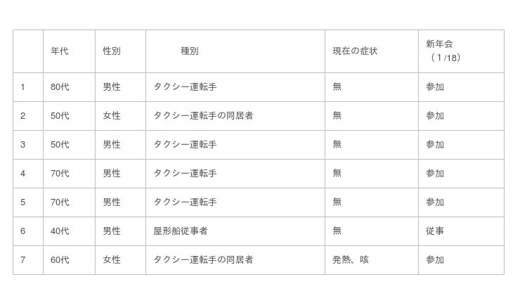 ○ 都内患者(2月13日判明)との濃厚接触者は、1月18日の新年会参加者・屋形船従事者、患者の同居者、個人タクシー組合支部従事者、患者が受診した医療機関の医療従事者、現時点で合計約190名を把握しており、全員を対象に、順次検査を実施しています。