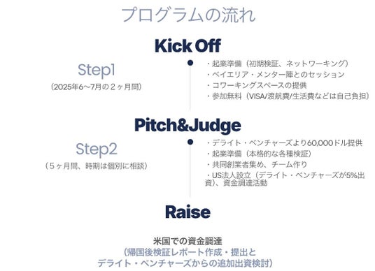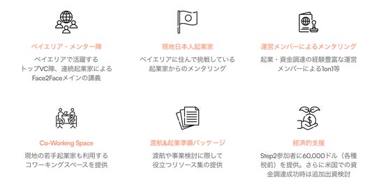 - Step2(5ヶ月間):Step1参加者の進捗を評価した上で、選抜された起業家に60,000ドル(約900万円相当)の資金を提供し、ベイエリアでの起業および資金調達活動の支援を提供します。