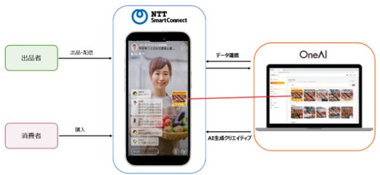 昨今のライブコマースのマーケット拡大とともに、さらなるCVRと売上の向上、配信にかかる稼働や視聴データのマーケティング活用などが配信者の課題としてあげられています。OneAIとNTTスマートコネクトは、視聴データ分析結果を活かしたクリエイティブ技術を活用して配信者および視聴者のエンゲージメント向上をめざし、クリエイティブ生成コストの削減と配信効果の最大化を図ることを目的としています。