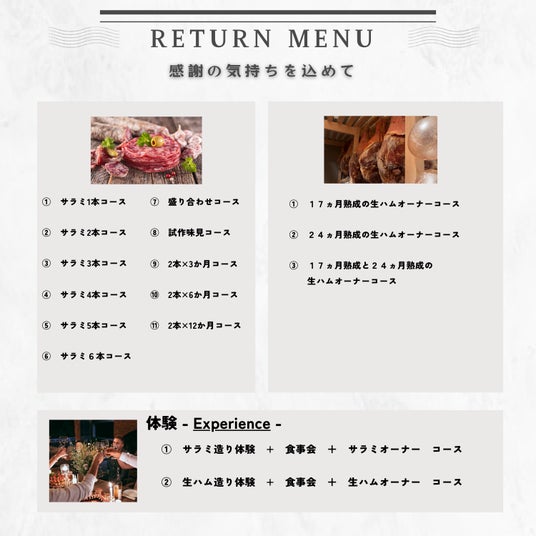 御礼の品:あり。本プロジェクトの実施による最初の生ハムやサラミなど