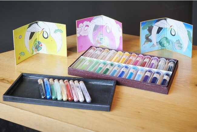 日本画の醍醐味である胡粉や岩絵具を溶いて絵の具を作る工程と、高橋氏があらかじめ施した下書きへの彩色に挑戦します。