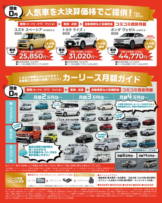 株式会社DeNA SOMPO Carlife(本社:東京都渋谷区、代表取締役社長:冨所 尚史)が提供するカーリース※1「SOMPOで乗ーる」(https://sompo-de-noru.jp/) は、2025年1月6日から大決算セールを開催します。