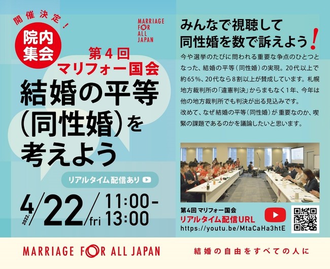 公益社団法人「Marriage For All Japan —結婚の自由をすべての人に」(以下、MFAJ)は2022年4月22日(金)午前11時~、議員会館にて、院内会議「第4回マリフォー国会 同性婚を考えよう」を開催します。