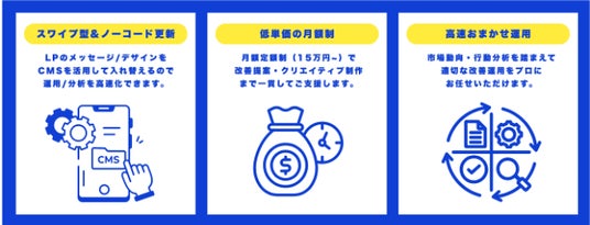 「LPワークス」はスワイプ型&ノーコードで更新できるCMSを活用し、クリエイティブやメッセージの入れ替えを容易にすることで、低単価の月額制プランで改善・運用を高速でおこなう体制を両立しました。