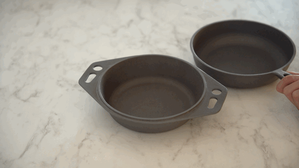 さらに2021年には、おもいのシリーズから、フライパンの「蓋」と「調理器具」の2つとして利用できる「おもいのマルチパン」を発表。試行錯誤を繰り返し、通常のフライパンではなし得ない熱伝導率と蓄熱温度の高さを実現。1.焼く2.煮る3.揚げるしか対応できなかった調理が、4.蒸す5.炊く6.重ねるの3用途で可能となった。