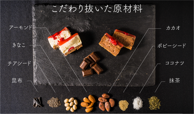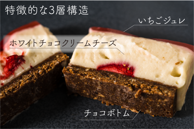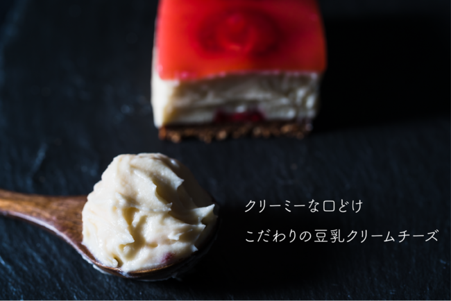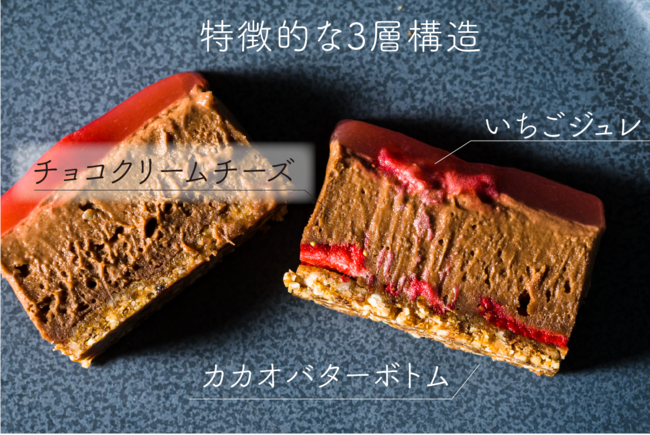今回のプロジェクトでは、乳や卵を一切使用していない、3層構造が特徴のヴィーガン対応のチーズケーキを実現しました。また、「MAAHA」を運営するMpraeso合同会社(本社:東京都新宿区、代表:田口愛)とコラボレーションすることによって、フェアトレードのカカオを使用しております。