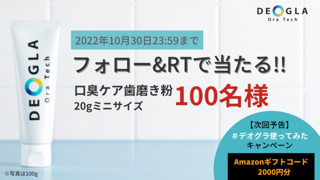応募いただいた方より抽選で100名様に口臭ケア【歯磨き粉『デオグラ オーラテック』20gのミニサイズ】をプレゼントいたします。