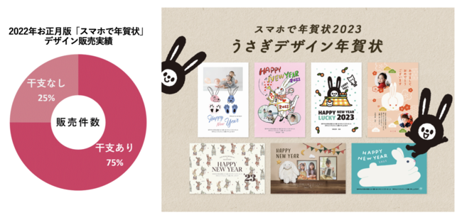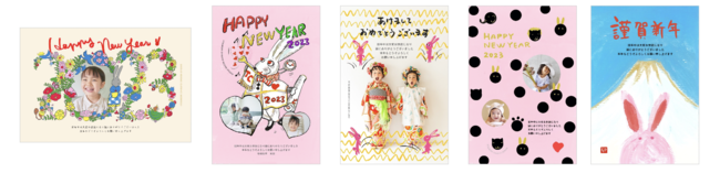 全体の75%※のご注文が干支入りデザインであるという実績から、「スマホで年賀状(R)」はお客様のニーズにお応えするべく、2023年の干支である「卯(うさぎ)」にちなんだデザインを1100点以上ご用意いたしました。自社開発している完全オリジナルデザインに加えて、タイアップ年賀状でも「スマホで年賀状(R)」でしか出会うことができないデザインを豊富に取り揃えています。「tsumori chisato」や「ファンタジスタ歌磨呂」など著名なデザイナーによる直々の描きおろしの卯(うさぎ)アートに加えて、「LIBERTY」や「SOU・SOU」など根強いファンの多いブランドの卯(うさぎ)柄も登場。さらに、「うさまる」や「ディズニー キャラクター」などお子様にも使いやすいデザインもラインナップ。