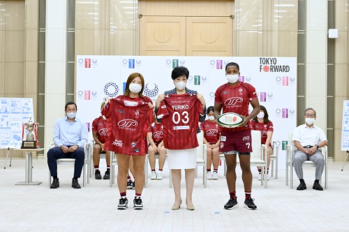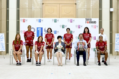 女子ラグビーチーム・東京山九フェニックスが小池百合子東京都知事に「太陽生命ウィメンズセブンズシリーズ2022」での年間総合優勝を報告するために都庁を訪問した。