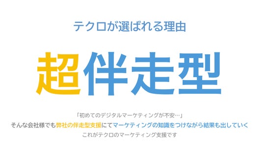 テクロ株式会社は、オンライン経由の問い合わせや商談を増やしたいBtoB企業様向けのWebマーケティング支援サービスを提供しています。 MVVに「モノづくりからコトづくりへ」を掲げ、「マーケティングでお客さまの商品・サービスの価値・体験を伝えたい」という気持ちで支援に取り組んでいます。
