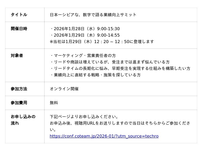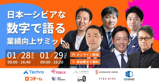 BtoB企業のリード獲得や商談化をデータドリブンで支援するテクロ株式会社(所在地:東京都渋谷区、代表取締役:天野 央登、以下当社)が、1/28(水)、1/29(木)に開催予定である株式会社O: (所在地:東京都中野区、代表取締役社長:谷本潤哉)が主催するカンファレンス「日本一シビアな、数字で語る業績向上サミット」に登壇いたします。